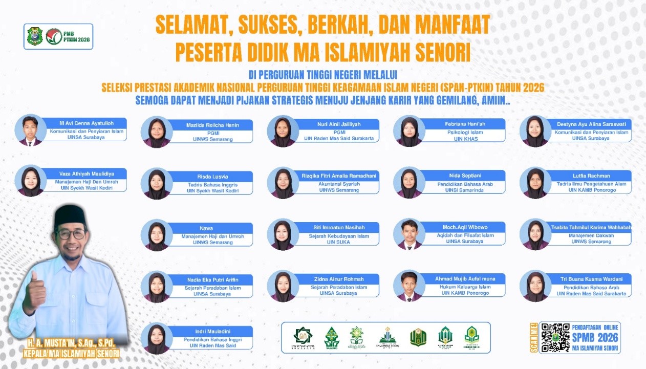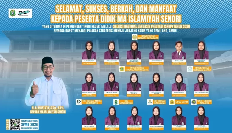 Senori, 20 April 2026 – Kabar membanggakan datang dari Madrasah Aliyah (MA) Islamiyah Senori. Pada tahun 2026 ini, puluhan siswa-siswi berhasil menorehkan prestasi gemilang dengan lolos seleksi masuk perguruan tinggi melalui jalur Seleksi Nasional Berbasis Prestasi (SNBP) serta Seleksi Prestasi Akademin Nasional Perguruan Tinggi Keagamaan Islam Negeri (SPAN-PTKIN).