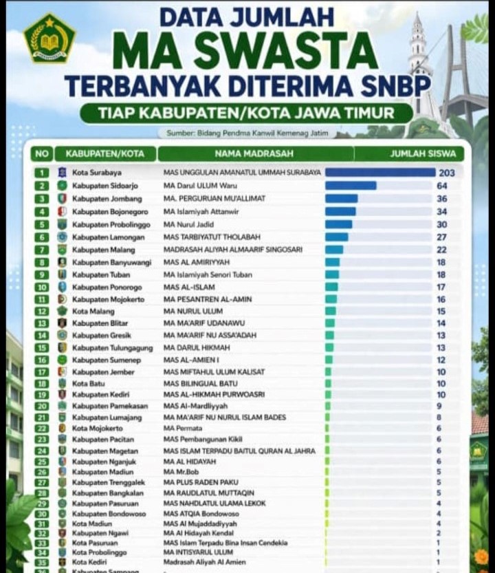 Prestasi ini semakin membanggakan karena MA Islamiyah Senori berhasil menempati peringkat ke 9 sebagai Madrasah Aliyah swasta terbanyak yang diterima melalui jalur SNBP se-jawa timur. Capaian ini menjadi bukti nyata berkualitas pendidikan serta dedikasi tinggi dari seluruh civitas akademika dalam membimbing siswa menuju masa depan yang cerah.